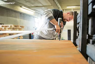 Beschichten und lackieren im kleinen Team von 4 Personen von Gartenobjekte und Stadtmöbel aus Metall. Über 90% ist Strukturlack, Feinstruktur auf Edelstahlblechen mit Haftgrund.